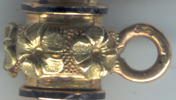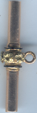 Clé ronde en or "orangé" surmontée en son centre de cinq fleurs à cinq pétales en or jaune.