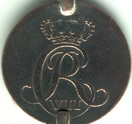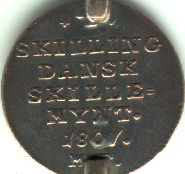 Clé royale avec l'inscription d'un "7" en chiffre romain, d'un "C" et d'un "R" entrelacés surmontés d'une couronne. Le verso porte l'incription "skilling dansk skille= mynt. 1807. M.T."