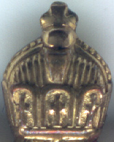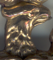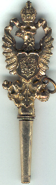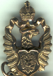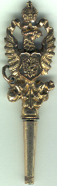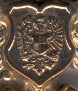 ". Emblème dans un écusson surmonté d'une tête d'aigle entouré d'ailes et le tout surmonté d'une couronne éclesiastique.