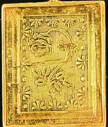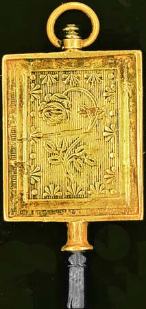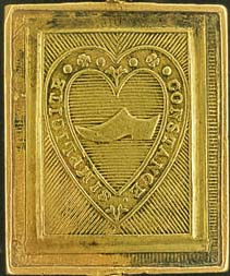Clé plaquette gravée représentant le métier de sabotier cordonnier. Sur une face, une chaussure dans un coeur et un décor floral sur l'autre face.