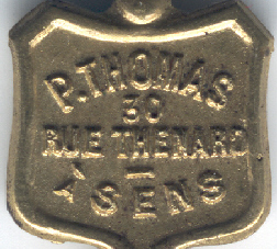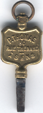 Clé publicitaire en laiton avec l'inscription "p. thomas 30 rue thenard à sens"