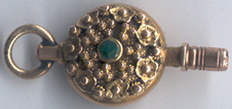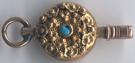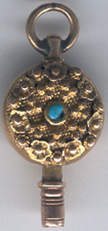 Clé en or avec une petite pierre turquoise de chaque côté de la clé