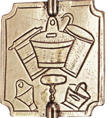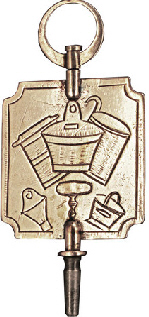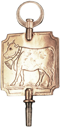 Clé en argent représentant sur une face une vache munie de sa cloche et sur l'autre face les ustensiles de la ferme.