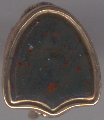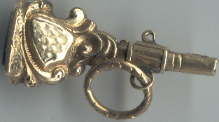 Petite clé en or joliement décorée et munie à sa tête d'une pierre verte tâchetée de rouge