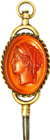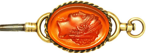 Clé en laiton doré représentant une tête de femme en pate de verre.